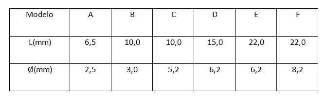 Terminais axiais com comprimentos de 40 mm ou radiais de 10 mm e diâmetros de 0,65mm; 0,80mm ou 1,10mm (podendo ser banhados a ouro)